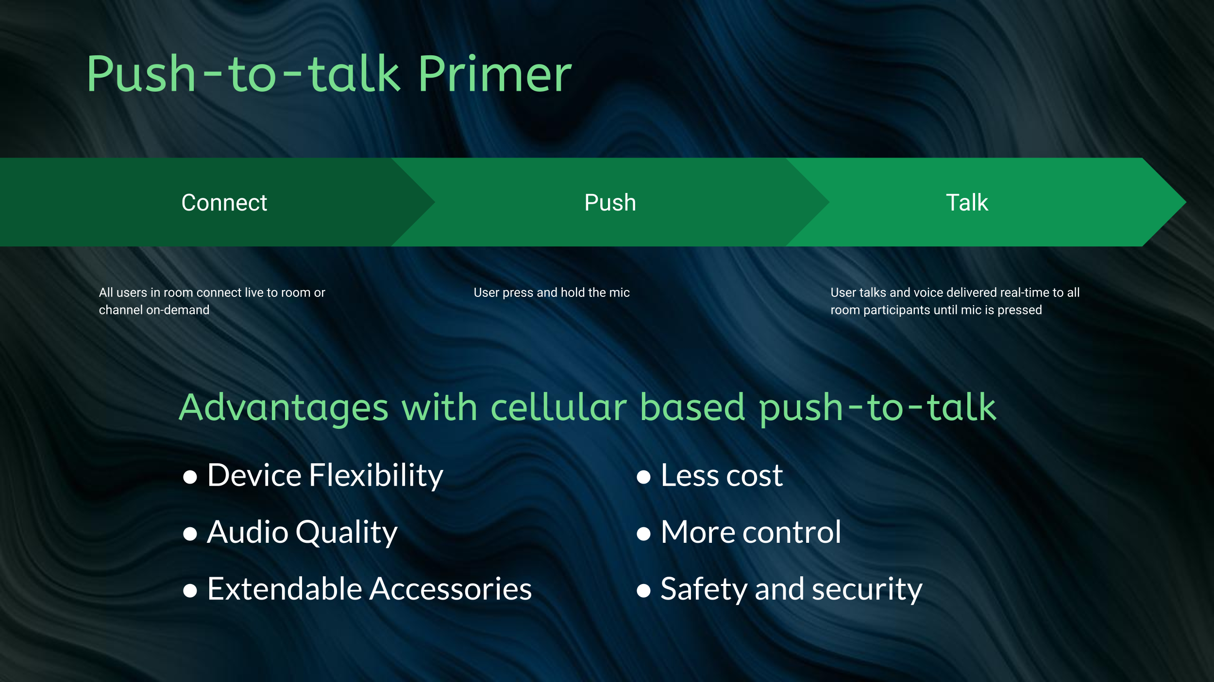 <figure><img src="https://340882075-files.gitbook.io/~/files/v0/b/gitbook-x-prod.appspot.com/o/spaces%2FqtJIlJ1AV3TAmINONrM7%2Fuploads%2FpHLHK2GkmhwmBII824R8%2FTalker%20Sales%20Deck%2030%20July.pptx.png?alt=media&#x26;token=8affe0e2-f3cb-4e0d-b28d-5c7ffadcf638" alt=""><figcaption><p>Push to talk primer</p></figcaption></figure>