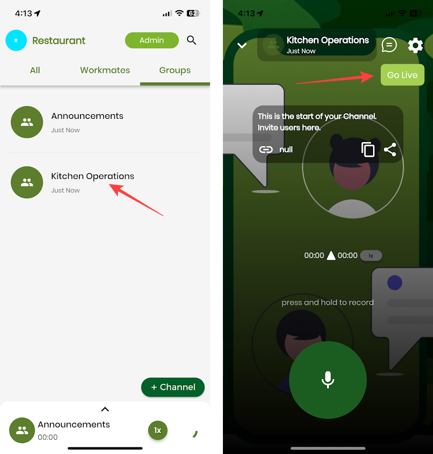 Once you create a channel, here's how to begin a push-to-talk among all the channel's members.